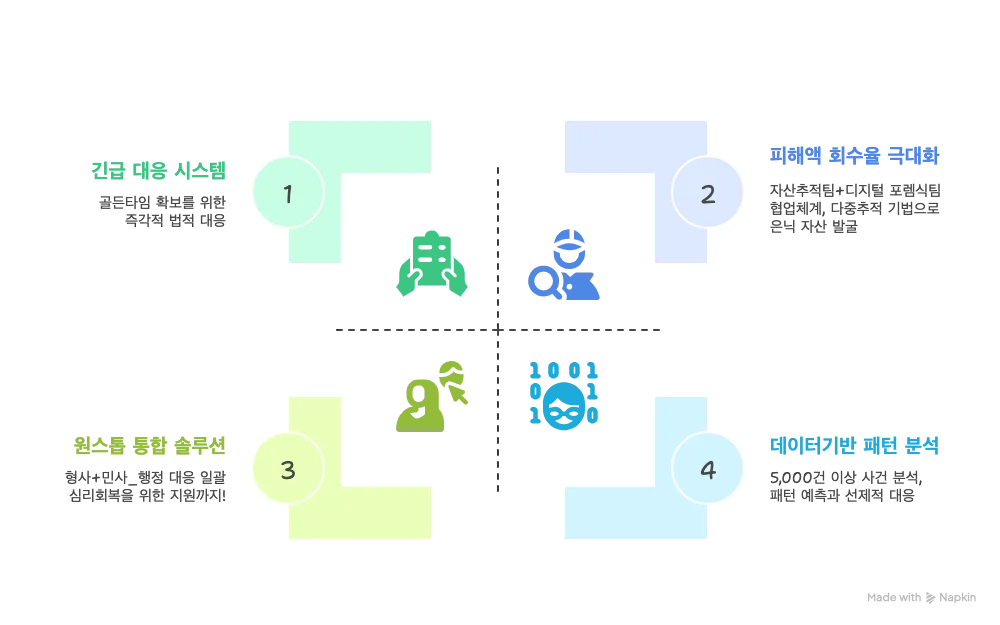 보이스피싱, 전세사기, 투자사기, 온라인 사기 등 현대 사기의 다양한 유형에 대해 형사고소부터 손해배상, 자산 회수까지 통합적인 원스톱 솔루션을 제공하고 있으니, 보이스피싱 피해를 겪으셨다면 슈가스퀘어와 상담하세요.