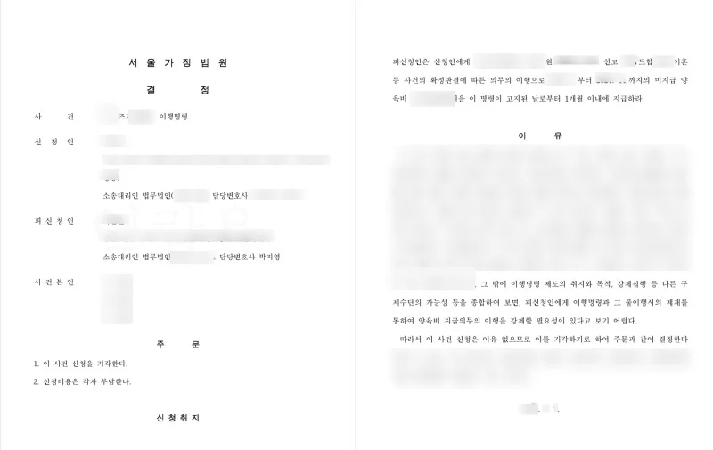 이행명령 신청후에는 사실관계, 지급 내역, 소명 자료에 따라 법원의 판단이 엇갈릴 수 있기 때문에, 이를 효과적으로 정리해 설득하는 데에는 법률 전문가의 전략적 조력이 도움이 됩니다.