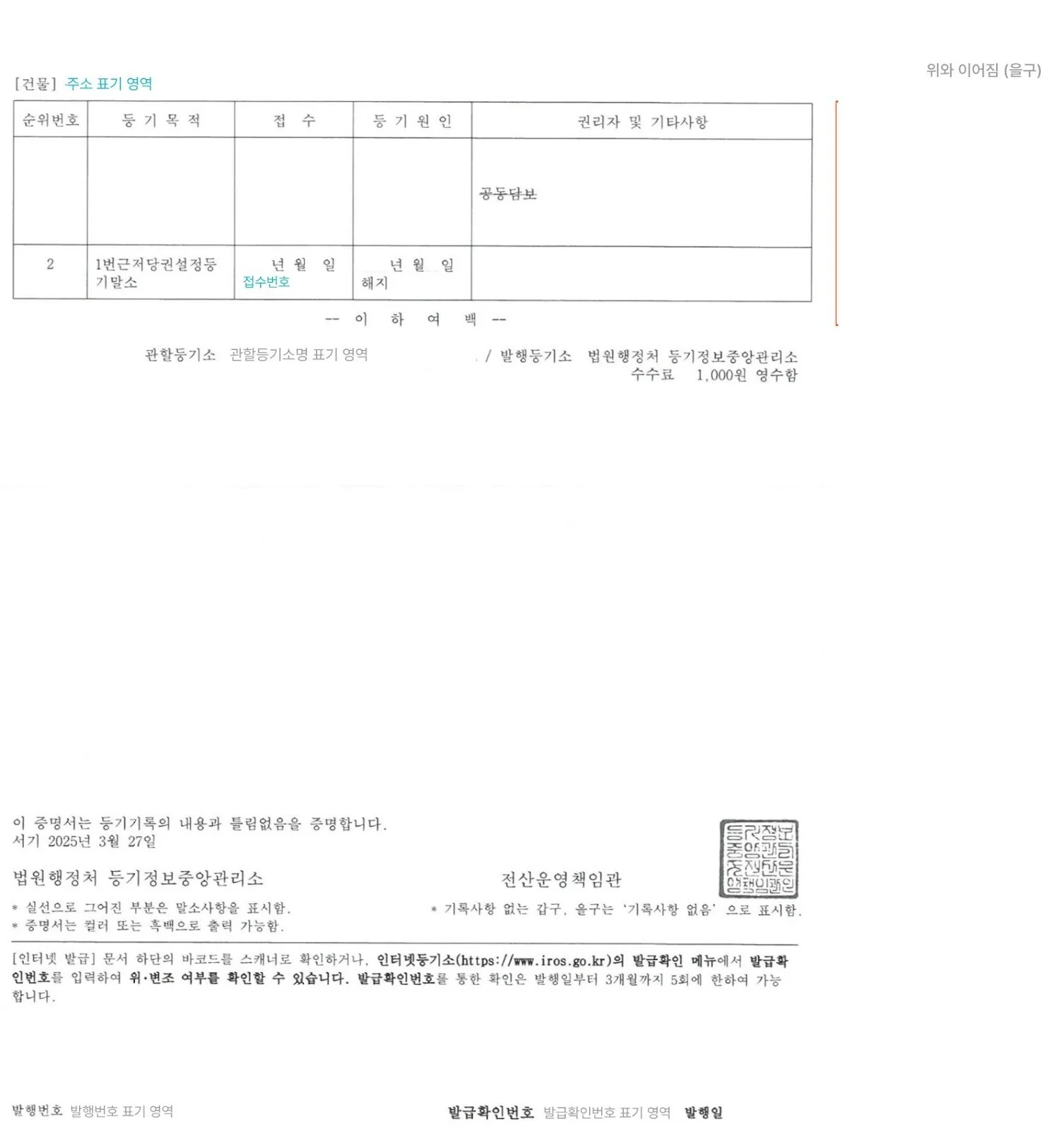 ✔️근저당권 (대출 규모 파악): 금융기관이 부동산을 담보로 돈을 빌려주고 설정하는 권리입니다.