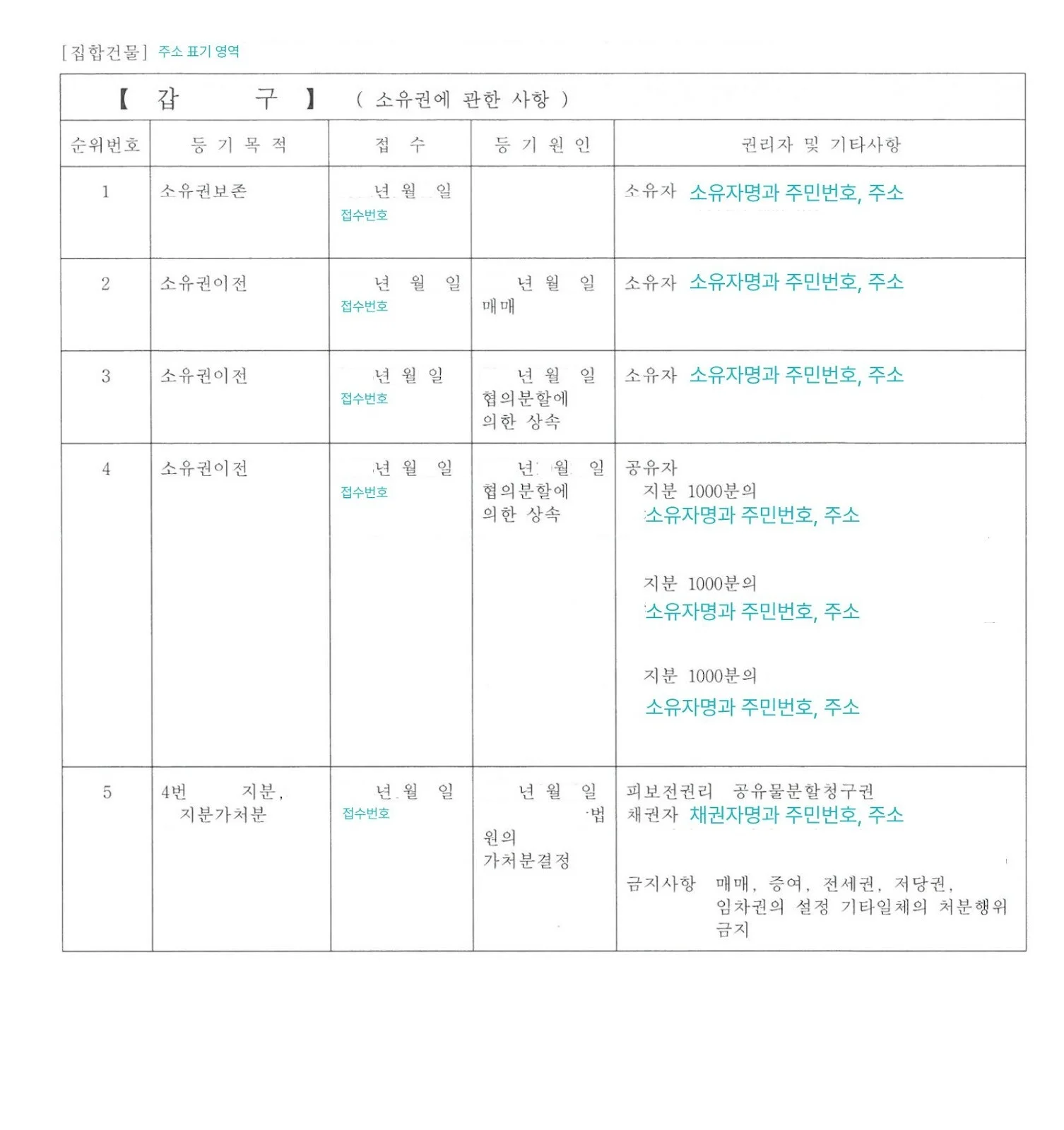 갑구는 소유권에 관한 사항을 기록하며, 진정한 소유자를 파악하고 소유권에 걸린 제한 사항을 확인할 수 있는 부분입니다.