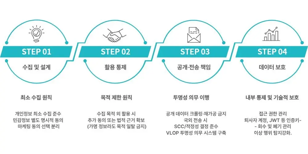 최소 수집 및 목적 제한: 데이터는 반드시 최소한으로 수집해야 하며, 정해진 목적 범위 내에서만 활용해야 합니다. (우리카드, 나이키 사례)