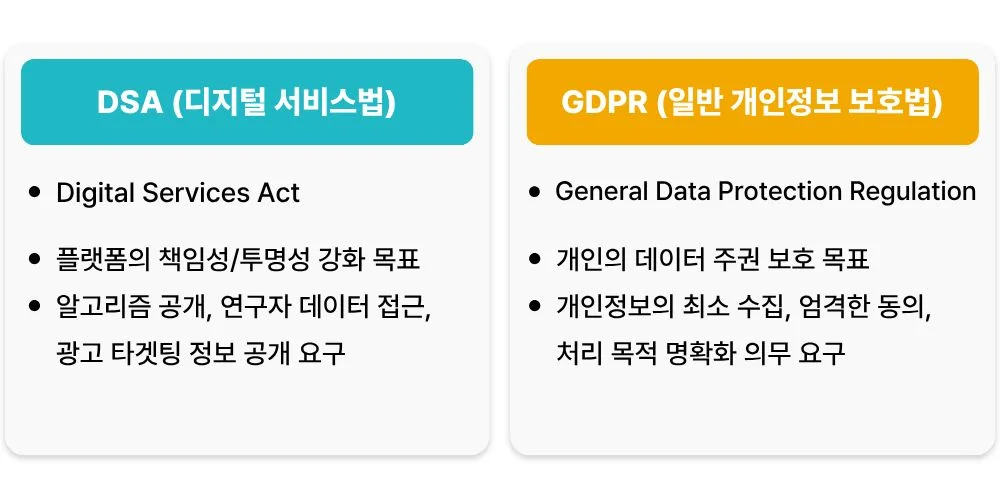 유럽연합(EU)이 플랫폼을 규제하는 방식이 바뀌고 있습니다. 과거에는 개인정보 보호(GDPR)만 신경 쓰면 됐지만, 이제는 플랫폼의 투명성까지 통제하는 디지털 서비스법(DSA)이 추가됐습니다. 문제는 이 두 법이 서로 정반대를 요구한다는 것입니다.