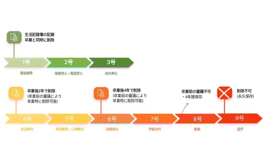 ๅๅใจใใฆใๅญฆๆ ก็ๆดป่จ้ฒ็ฐฟใใธใฎ่จ่ผๅฏพ่ฑกใงใใ1ๅท๏ผๆธ๋ฉด่ฌ็ฝช๏ผใ2ๅท๏ผๆฅ่งฆ็ฆๆญข๏ผใ3ๅท๏ผๆ กๅ ๅฅไป๏ผๆช็ฝฎใซใคใใฆใไธๅฎใฎ่ฆไปถใๆบใใใๅ ดๅใซ่จ่ผใๅ ้ใ๏ผ็ไฟ๏ผใใฆใใใๅถๅบฆใใใใพใใใใใใๆกไปถไปใ่จ่ผ็ไฟใใจใใใพใใ่จ้ฒใๆฎใใชใใใฃใณในใไธใใไป็ตใฟใงใใใไปฅไธใฎใใใชไพๅค็ใชใฑใผในใงใฏ่จ่ผ็ไฟใ้ฉ็จใใใพใใใ