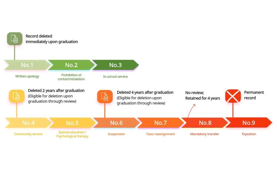 In Korea, school violence measures are not intended to stigmatize students but serve as administrative records to manage guidance and educational efforts. These records do not contain lengthy descriptions or subjective evaluations; they are documented strictly within the scope required for academic management. Since these entries are governed by Ministry of Education guidelines rather than individual discretion, parents need not fear arbitrary recording. However, the retention and deletion periods vary significantly depending on the "Measure Number" assigned.