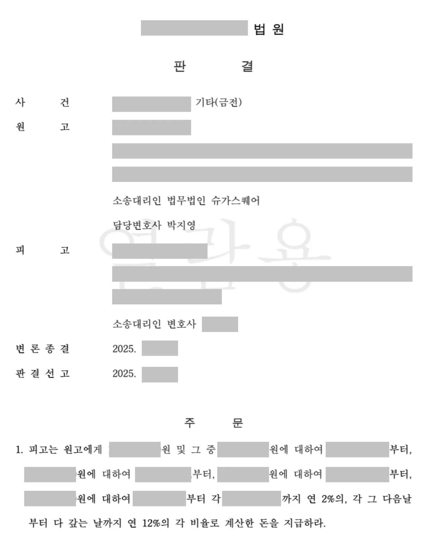 이 사건에서 슈가스퀘어는 A님을 대리해 공사지연에 시행사 B의 책임이 있음을 인정받고, 분양대금 반환과 위약금까지 모두 인정받았습니다.