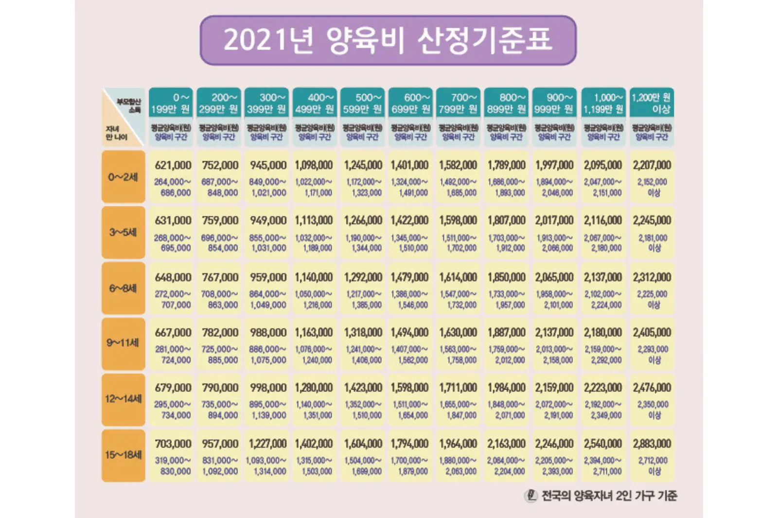 부모의 세전 소득을 모두 합산 + 자녀의 만 나이를 기준표에 대입해 ‘표준 양육비’를 정하고,